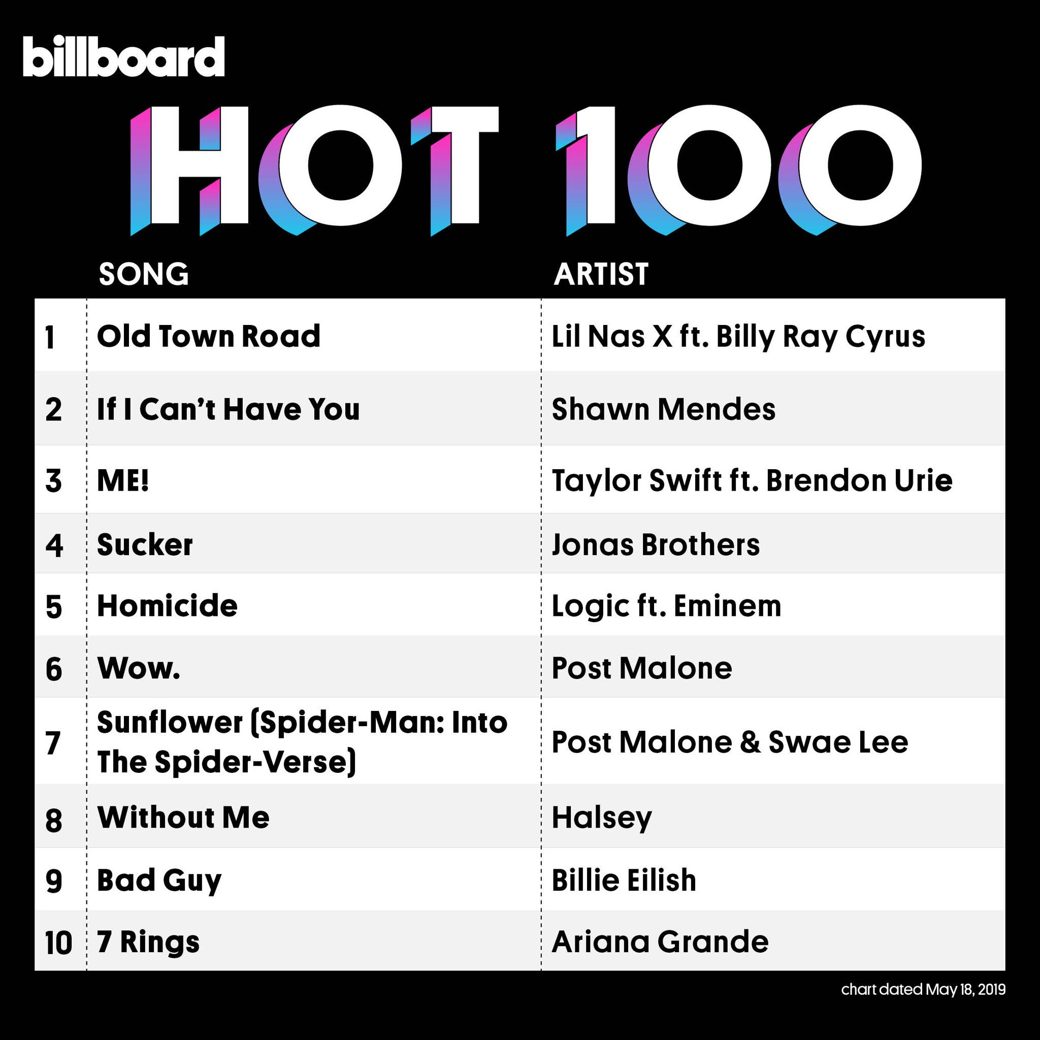 Billboard Charts On Twitter The Hot100 Top 10 Chart Dated May 18 2019